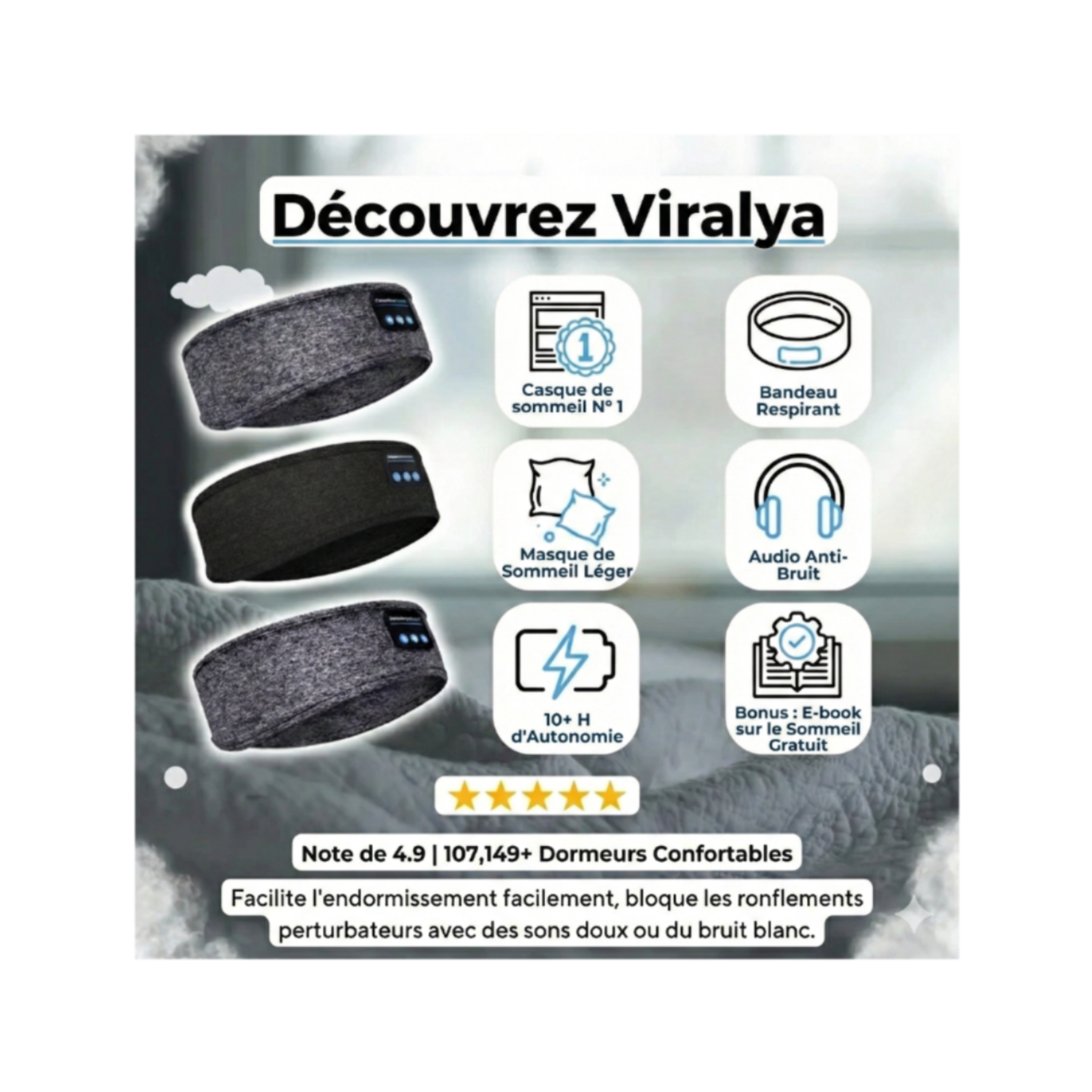 Au-delà du sommeil, le bandeau Viralya est votre allié pour toute quête de tranquillité. Parfait pour la méditation ou pour transformer les trajets bruyants en moments de sérénité. Il crée votre bulle de paix, où que vous soyez.